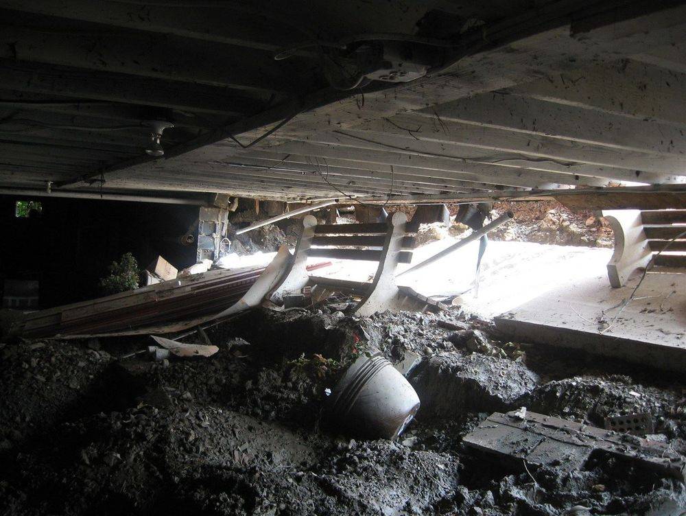 View from inside basement, looking towards collapsed segment of block foundation wall.